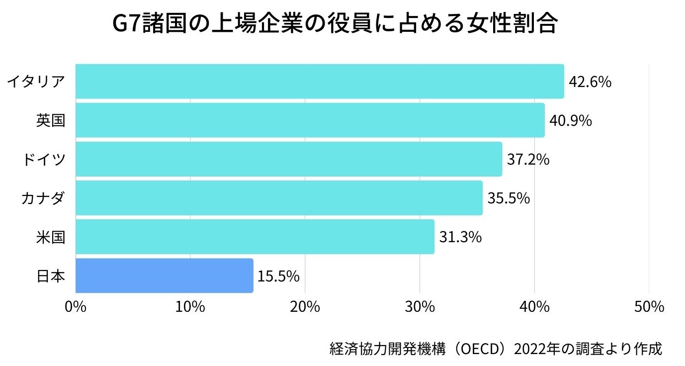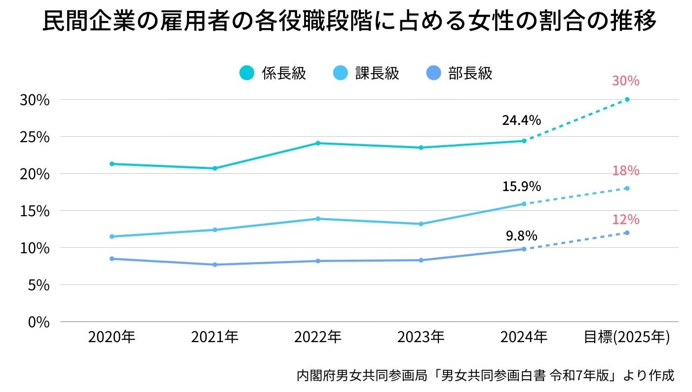 日本の100名以上の民間企業での女性管理職比率は24.4%(2024年・厚生労働省)にとどまり、政府が掲げる「30%」にはまだ隔たりがあります。加えて、上場企業での女性役員の比率は15.5%とG7諸国と比べても圧倒的に低く、ロールモデルの不足が女性のキャリア形成に影響を与えています。