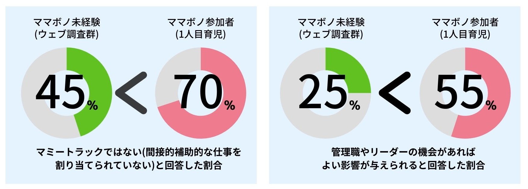 実際に、ママボノ参加者は未経験者に比べて、「マミートラックではない」と感じる割合や「リーダー機会があれば良い影響を与えられる」と回答した割合が高いなど、キャリア意識の変化がデータとしても表れています。という調査結果もあります